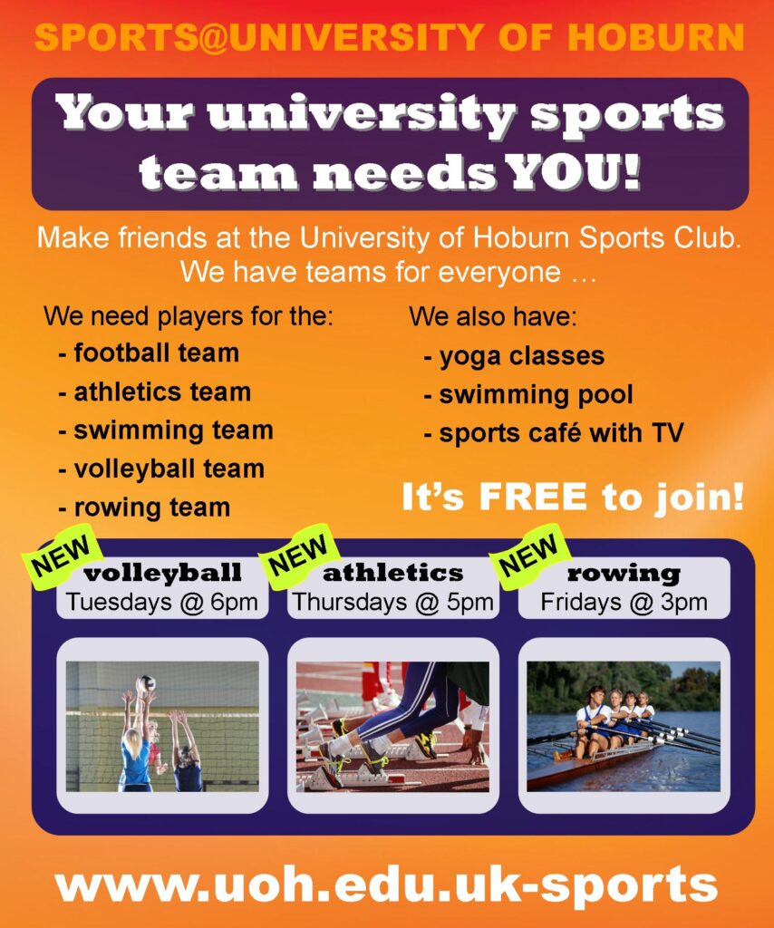 The University of Hoburn needs players for the football team, athletics team, volleyball team, rowing team and the ___.